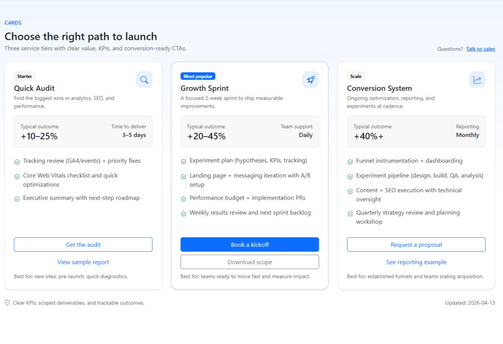 Responsive Marketing Feature Cards with KPI Badges and CTA Buttons (Bootstrap 5.3)