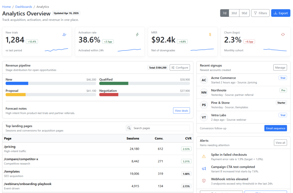 A clean, responsive analytics dashboard with KPI cards, pipeline progress, top pages, and recent signups. Built for real SaaS reporting...