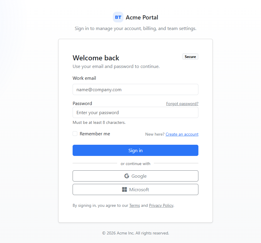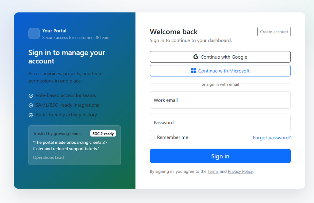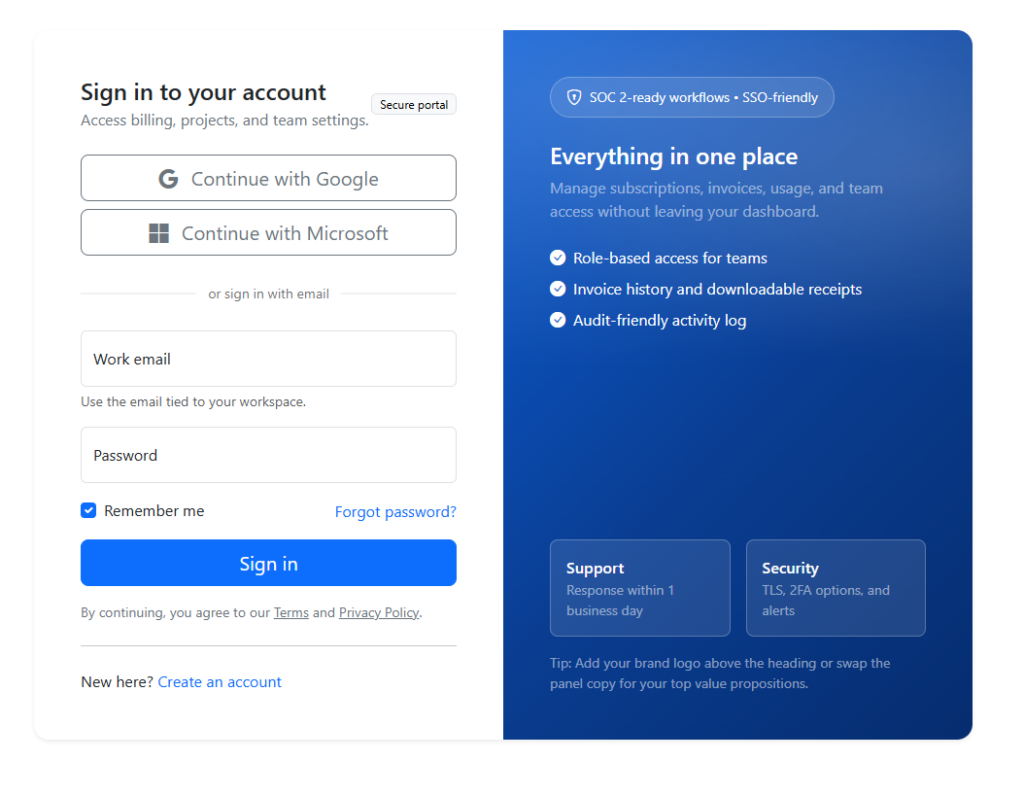 A clean, responsive login layout with a branded side panel, concise trust messaging, and accessible form controls—ideal for SaaS portals...