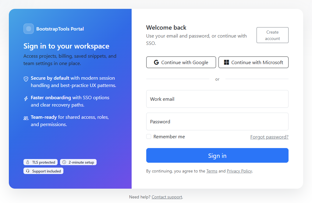 A portal-ready login layout with a clean two-column design, social sign-in buttons, and a conversion-friendly value panel. Built for Bootstrap...