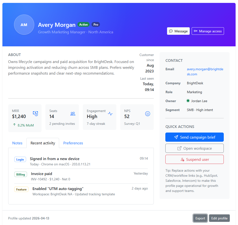 A portal-ready user profile layout with a cover header, identity block, quick actions, KPIs, and contact details. Designed to work...